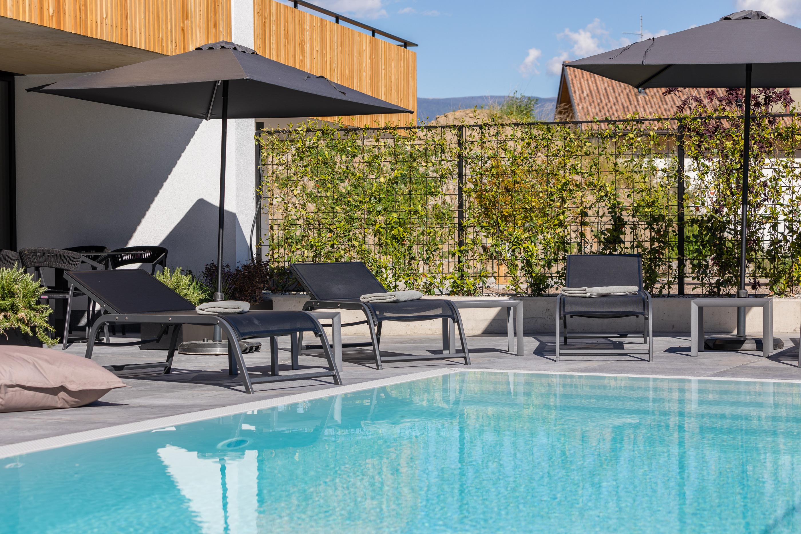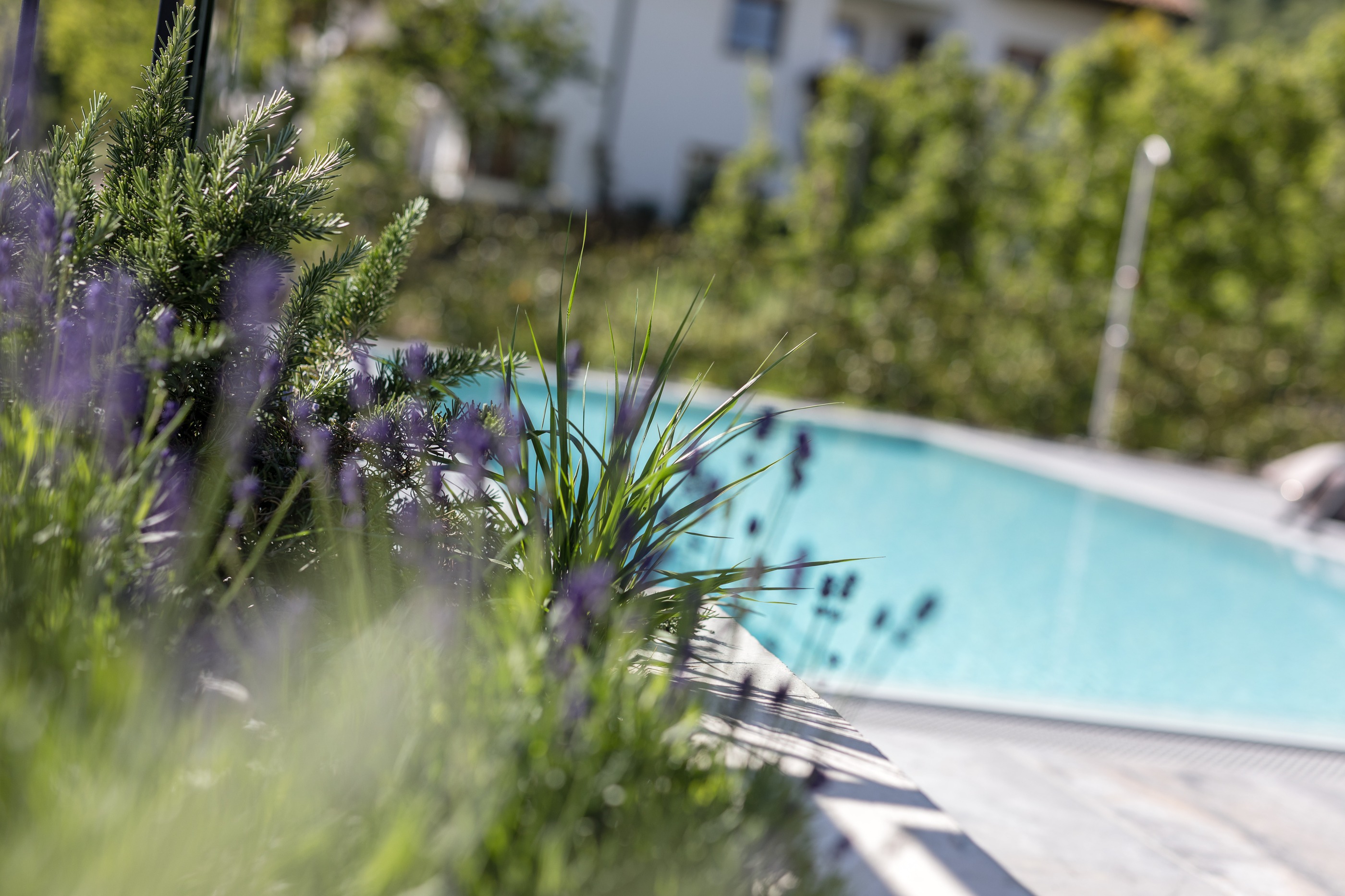 Ein Sole-Pool im Garten. Auf 8 x 3,5 Metern fällt es leicht zu sich zu kommen. Während der Körper im angenehm temperierten Salzwasser entspannt und die leicht sich kräuselnden Wellen ihn umschmeicheln, lauscht das Ohr der Stimme der Ruhe. Ihre Kraft ist bis ins Innere spürbar, während der Blick in die Weite schweift.