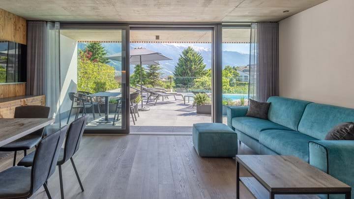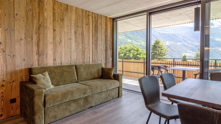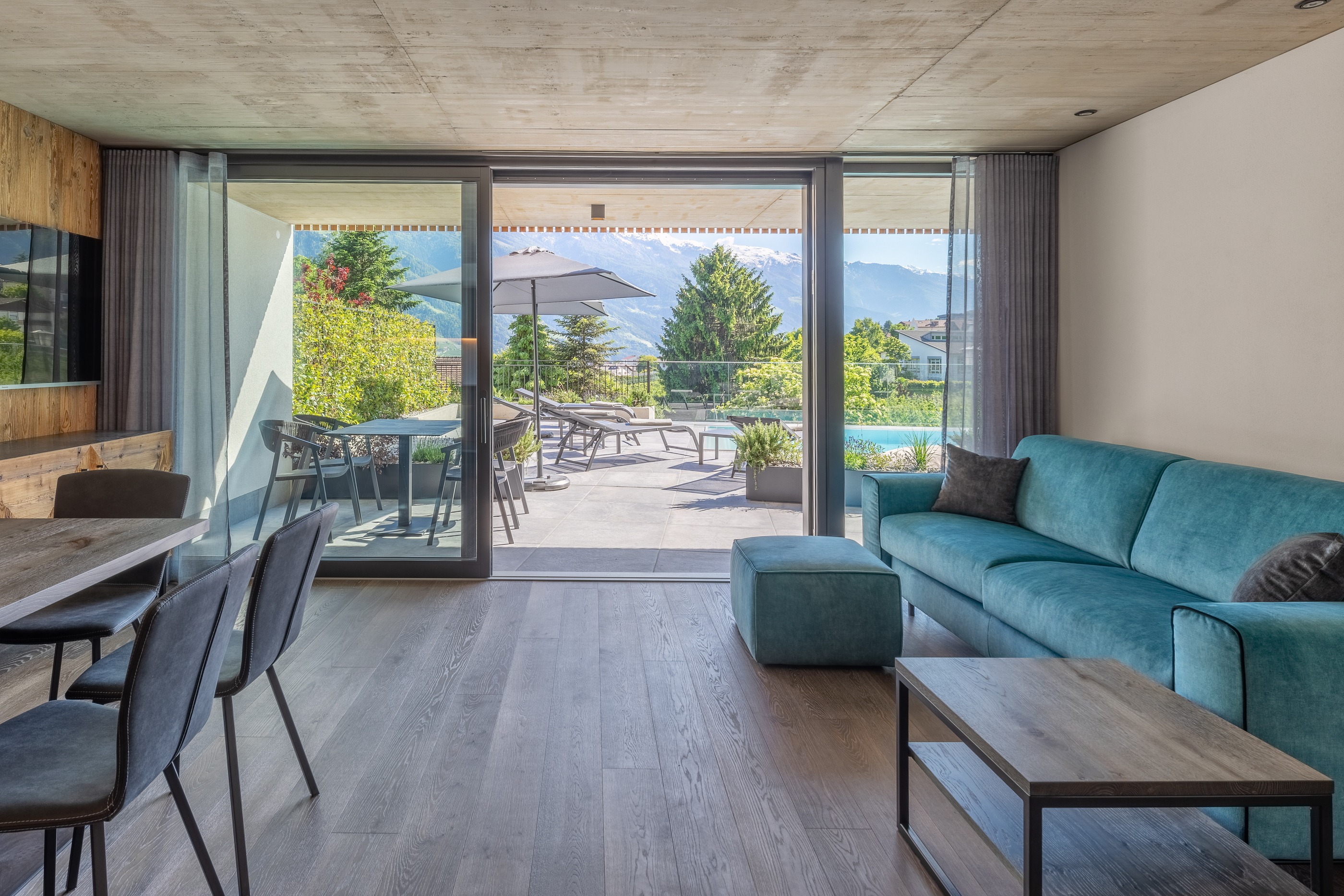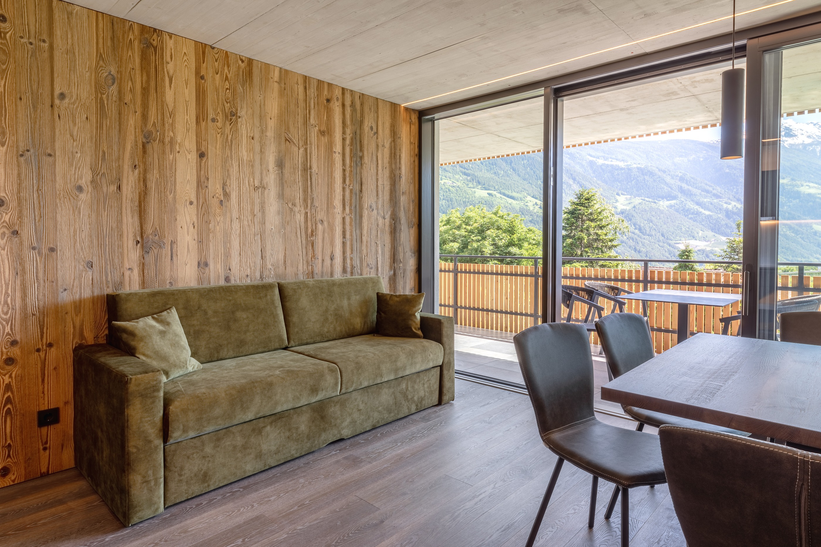 Altholz und hochwertige Stoffe, die in Farbe und Stil harmonieren. Behaglichkeit und Moderne – zwei Eigenschaften, die sich nicht per se gegenseitig ausschließen. So wird eine Atmosphäre geschaffen, in der viel Platz zum Durchatmen ist. Und beim Blick aus dem Fenster und vom Balkon eröffnen sich Ausblicke, die dem Auge schmeicheln und der Seele guttun.